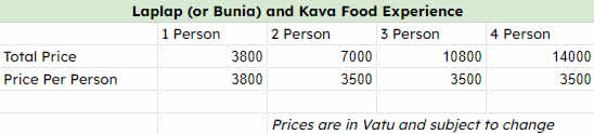 • Following lunch, the Laplap or Bunia preparation begins. You’ll accompany the locals in preparing one of these two dishes.